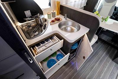- Großer 135Liter Kühlschrank inkl. Gefrierfach und Getränkefach mit automatischer Energiewahl (12V, 230V, Gas)