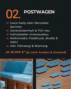 Wir beschaffen geprüfte Fahrzeuge der Marken Iveco Daily oder Mercedes Sprinter mit 60.00080.000 km Laufleistung und maximal 13 Jahren alt (Euro 5 Norm). Jedes Fahrzeug wird von uns komplett gewartet, instandgesetzt und individuell nach Kundenwunsch ausgebaut.