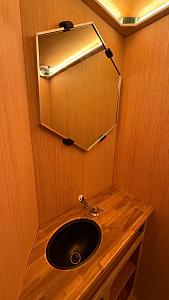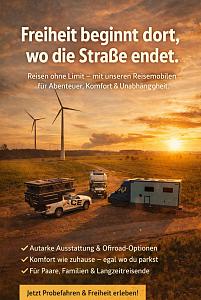 Unser Vorführfahrzeug ist für max. 3 Personen konzipiert. Der wohnliche Innenausbau aus Holz bietet neben einem Bad mit Trockentrenntoilette und großer Dusche (80x80cm), eine große Küche und eine geräumige Sitzecke, die im Handumdrehen zu einem 2x2m großen Bett umfunktioniert werden kann.