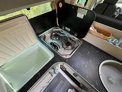- praktische Küche im hinteren Bereich mit Gasherd und Kühlschschrank,