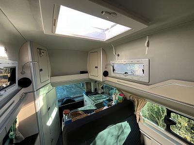 - festes Hochdach, so dass, wenn das obere Bett nicht rausgeschoben ist, immer eine angenehme Stehhöhe ist