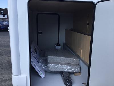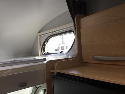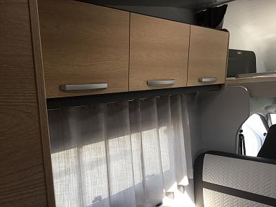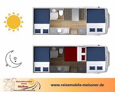 Im Heck des Fahrzeugs befindet sich ein großes Doppelbett, ein weiteres über der Fahrerkabine (Alkoven).