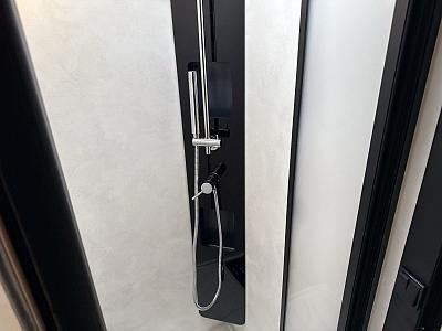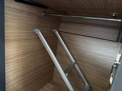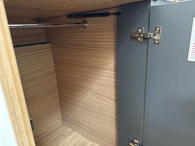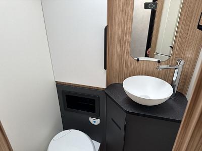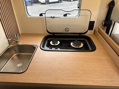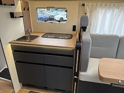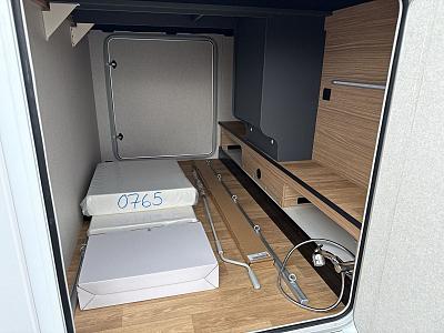 Das Modell verfügt über eine vollausgestattete Küche, ein Badezimmer mit getrennter Dusche und eine große Heckgarage.
