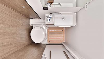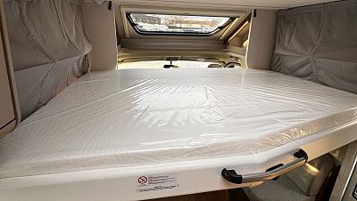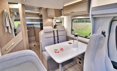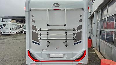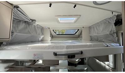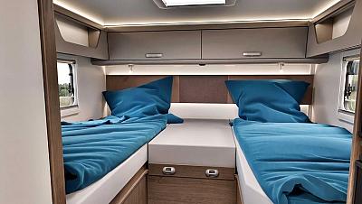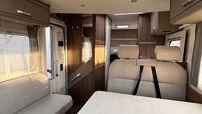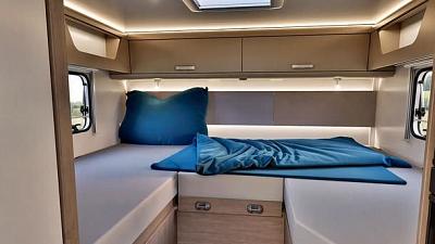 Im Heck befinden sich zwei Einzelbetten, die sich zu einem großen Doppelbett umbauen lassen. Im vorderen Bereich findest du zusätzlich ein großes Hubbett. Der T448 ist mit einem Fahrradträger und einer Markise ausgestattet. Für das Entertainment-Programm sorgt ein 22 Zoll TV. Die Rückfahrkamera und die große Heckgarage machen deinen Urlaub besonders entspannt, auch, wenn du zum ersten Mal ein Wohnmobil fahren solltest.